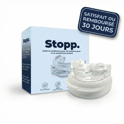 Stopp™, en déplaçant délicatement la mâchoire inférieure vers l'avant, élargit les voies respiratoires, réduisant les vibrations des tissus et atténuant les ronflements perturbateurs.